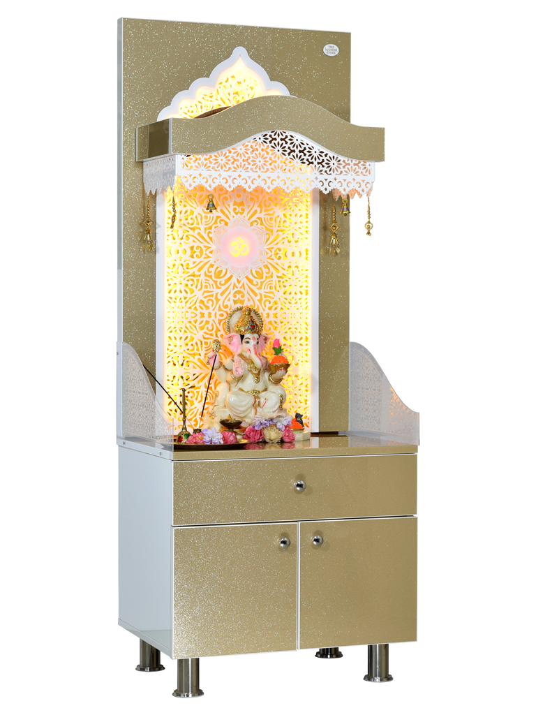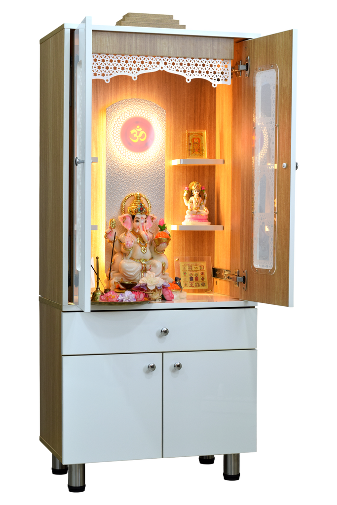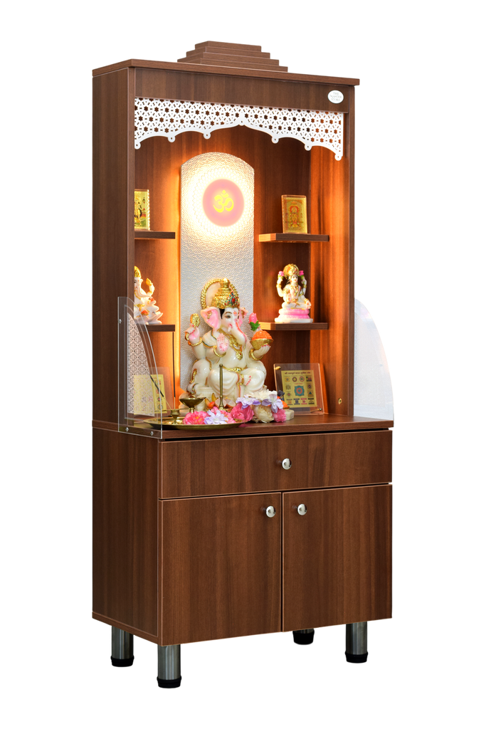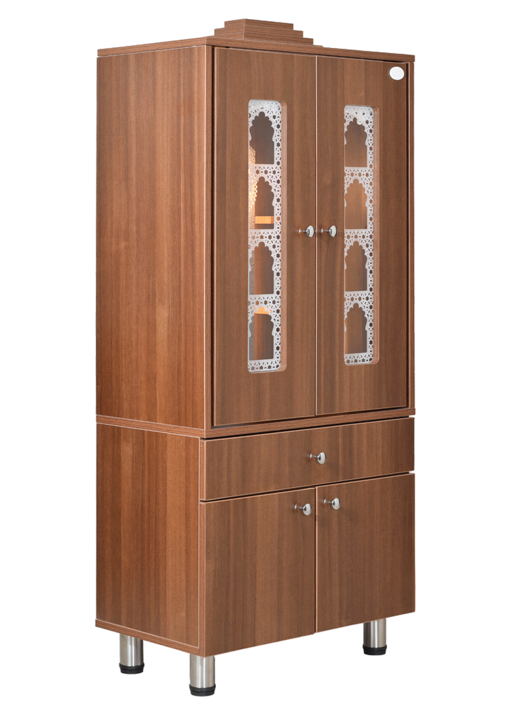 The contemporary yet classical wooden mandir is desgined keeping in view the space requirements for various pooja essential Diety Idols / Frames / Photos. The temple also features a closed layout with distinguished venetian blinds in same color. The extra storage base cabinet features a drawer with pull-out ray for extending the pooja platform really helpful in keeping pooja essentials during long puja rituals. The platform height from ground is 24 inches. This designer mandir is ideal for homes, offices & foyar area of hospitals, institutions.