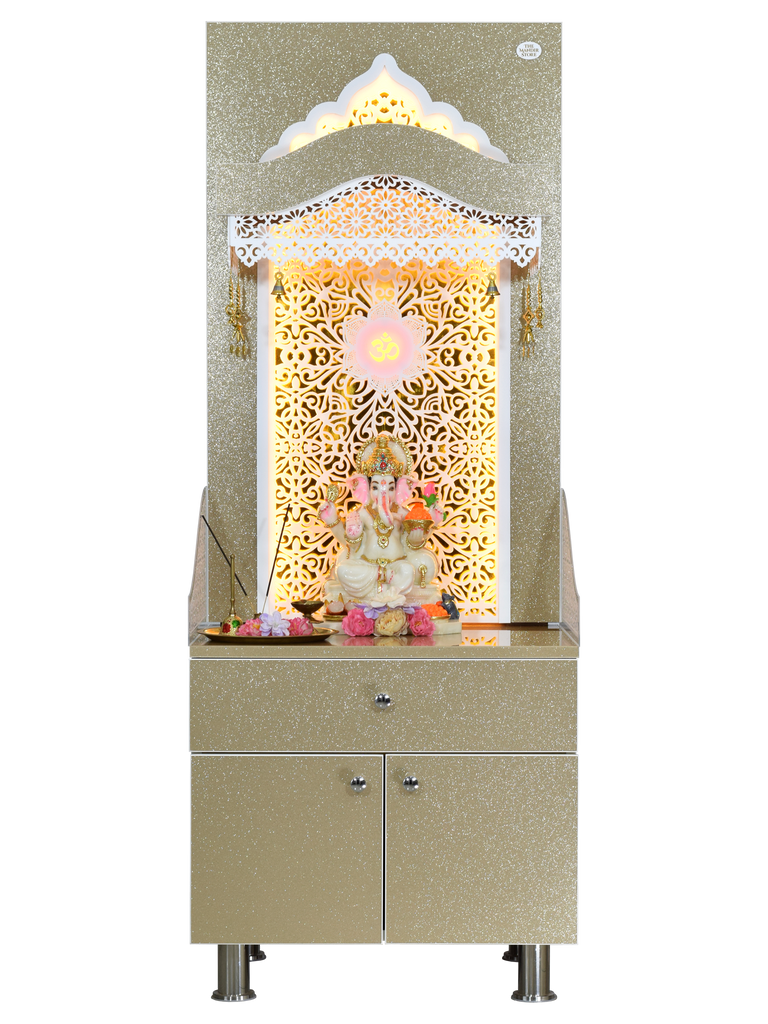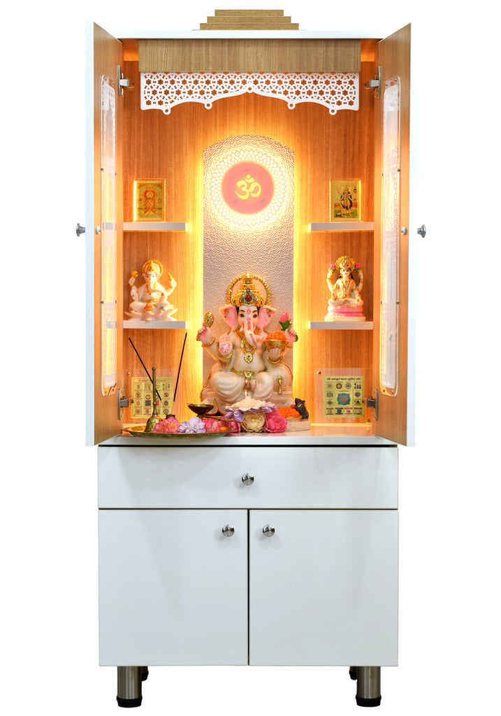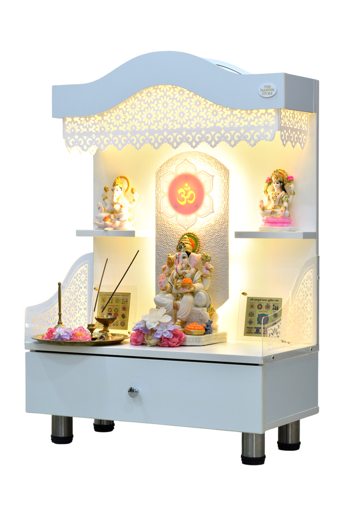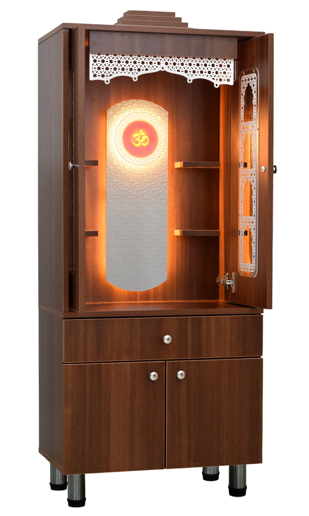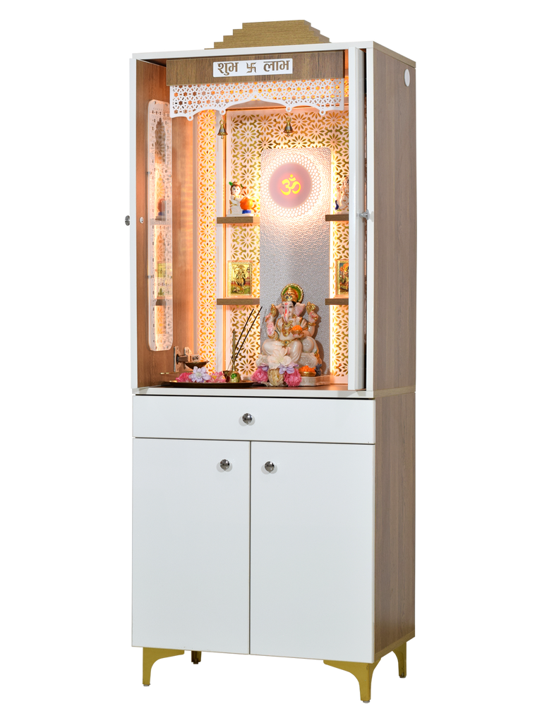 The contemporary yet classical wooden mandir is desgined keeping in view the space requirements for various pooja essential Diety Idols / Frames / Photos. The temple also features a closed layout with distinguished venetian blinds in same color. The extra storage base cabinet features a drawer with pull-out ray for extending the pooja platform really helpful in keeping pooja essentials during long puja rituals. The platform height from ground is 24 inches. This designer mandir is ideal for homes, offices & foyar area of hospitals, institutions.