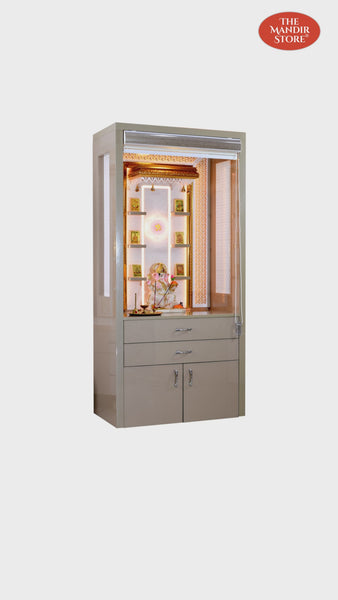 Storage Solutions: Comes with a chest of 2 drawers and shutters cabinet, providing ample storage space for your prayer essentials like incense sticks, diya stands, and holy books. Keeps your worship area organized and clutter-free.